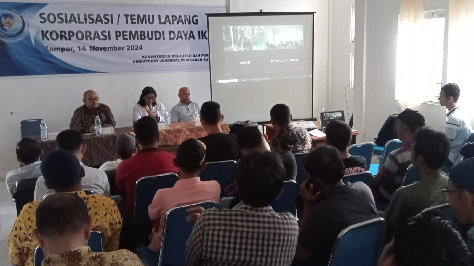 Kegiatan Sosialisasi/Temu Lapang Korporasi Pembudi Daya Ikan ini digelar di Aula Rapat, UPT Usaha Produksi Hasil Perikanan, Dinas Perikanan Kabupaten Kampar, Jalan Sungai Kampar, Dusun IV Kampung Baru, Desa Koto Mesjid, XIII Koto Kampar, Kabupaten Kampar.